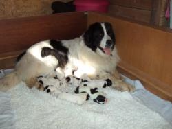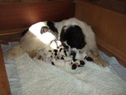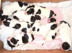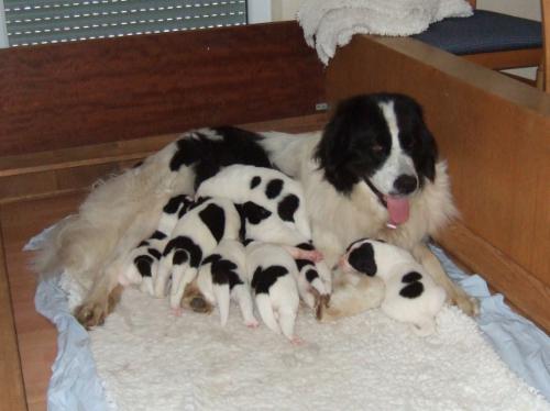 | Um 10.30 kam der erste Welpe zur Welt, an einem heißen Sommer-Samstag. Dann begann eine Geduldsprobe, drei Stunden später kam das nächste Baby, doch dann ging es nicht mehr weiter. So fiel dann die Entscheidung Kaiserschnitt, und es kamen um 17.00 Uhr weitere sechs Welpen zur Welt. Mutter und Welpen sind wohlauf. Es sind 2 Rüden und 6 Hündinnen! | ![]() |